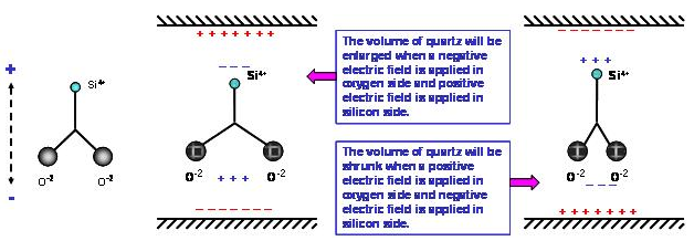 石英材料中的二氧化硅分子(SiO2) 在正常狀態(tài)下, 其電偶極是互相平衡的電中性. 在(如圖)的二氧化硅是以二維空間的簡(jiǎn)化圖形. 當(dāng)我們?cè)诠柙由戏郊把踉酉路椒謩e給予正電場(chǎng)及負(fù)電場(chǎng)時(shí), 空間系統(tǒng)為了維持電位平衡, 兩個(gè)氧原子會(huì)相互排斥, 在氧原子下方形成一個(gè)感應(yīng)正電場(chǎng)區(qū)域, 同時(shí)在硅原子上方產(chǎn)生感應(yīng)負(fù)電場(chǎng)區(qū)域. 相反的情況, 當(dāng)我們?cè)诠柙由戏郊把踉酉路椒謩e給予負(fù)電場(chǎng)及正電場(chǎng)時(shí), 兩個(gè)氧原子會(huì)相互靠近, 氧原子下方產(chǎn)生感應(yīng)負(fù)電場(chǎng),硅原子上方產(chǎn)生感應(yīng)正電場(chǎng). (如圖). 然而, 氧原子的水平位置變化時(shí),迫使氧原子回到原來的空間位置. 因此, 電場(chǎng)的力量與原子之間的力量會(huì)相互牽動(dòng), 電場(chǎng)的改變與水平方向的形變是形成交互作用狀態(tài).