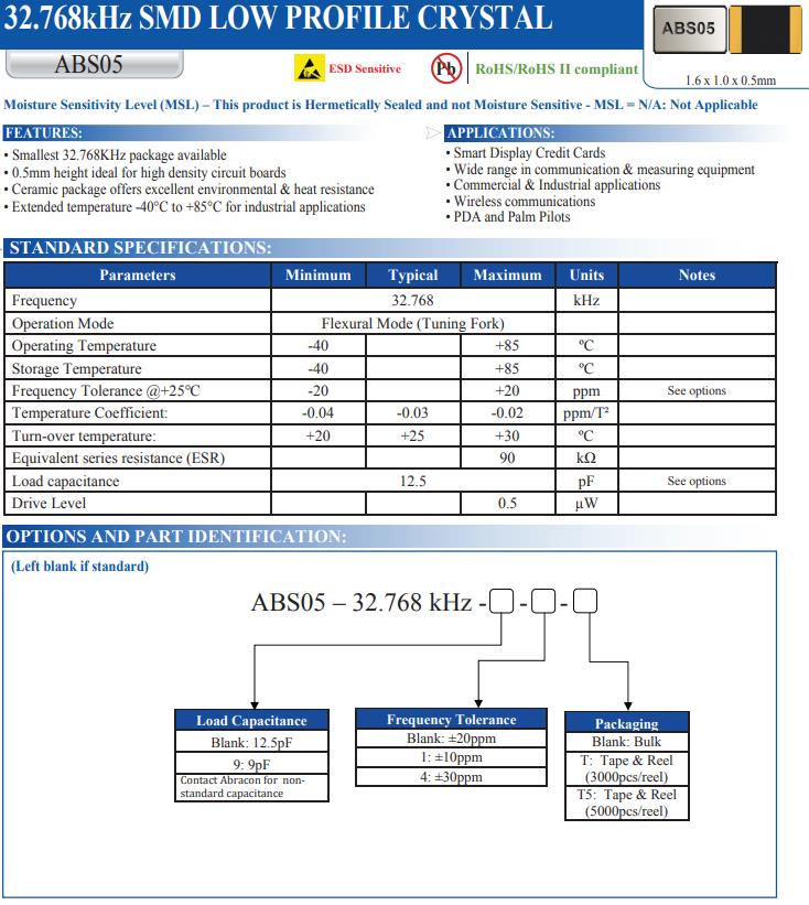 | ABS05-32.768KHZ-T | Abracon晶振 | ABS05 | kHz Crystal (Tuning Fork) | 32.768kHz | 2-SMD, No Lead |