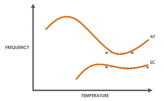 • 更高的工作溫度:SC 切割晶體的轉折點高于 AT 切割晶體,使其成為烘箱應用的理想選擇。這種較高轉折點的缺點是在較低溫度下急劇下降。由于這一特性,SC 切割晶體僅適用于恒溫振蕩器,在其他振蕩器配置(TCXO、VCXO 等)中無法正常工作。
