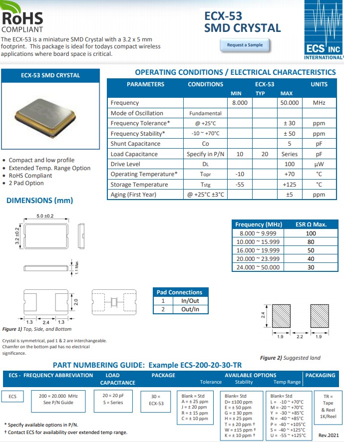 ECS晶振推出ECX-53是一款緊湊型5.0mmx3.2mm雙焊盤表面貼裝晶體,提供8MHz至50MHz的頻率范圍。ECX-53系列晶體提供10ppm的嚴格頻率和穩定性選項,以及-50°C至+125°C的擴展溫度范圍選項。標準部分提供20pF負載電容,工作溫度范圍為-10°C至+70°C。這種電子元件非常適合無線、Wi-Fi、藍牙和物聯網應用。提供了擴展的溫度范圍選項。ECS-100-8-30-JGN-TR是當今緊湊型無線的理想選擇,是非常適合當今電路板空間至關重要的緊湊型無線應用。