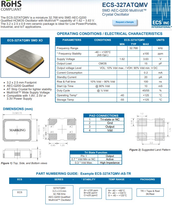 | ECS-327SMO-TR | ECS Crystal | ECS-327SMO | 32.768kHz | -40°C ~ 85°C |