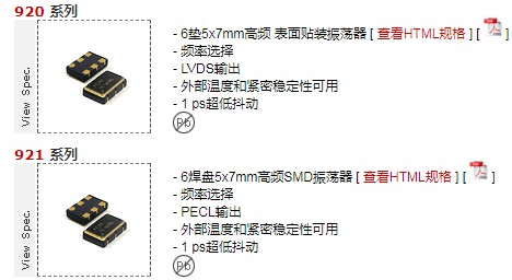 Oscilent晶振推出低成本LVDS和LV-PECL輸出差分晶振,對應型號920和921系列,為高頻差分晶體振蕩器.頻率106.25MHZ-212.5MHZ范圍,低電源電壓范圍3.3V~5V,存儲溫度可達-55℃-125℃范圍,滿足高溫度要求產品.該系列差分晶振采用小型5.0x7.0mm封裝,采用接縫密封陶瓷6腳焊盤配置,符合國際RoHs/Lead Free標準.