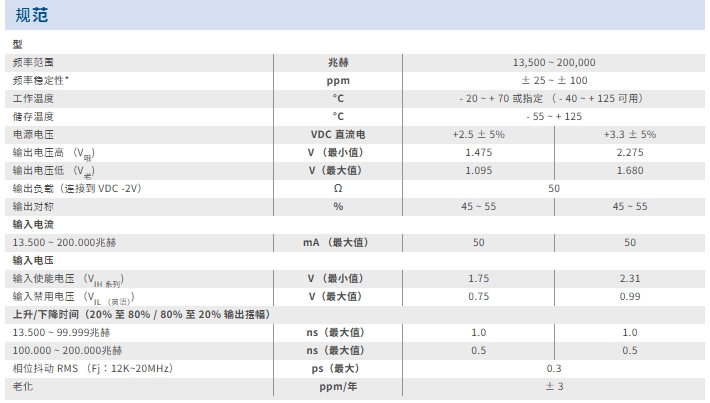 庫存頻率包括25 MHz、100 MHz、125 MHz、155.52 MHz和156.25 MHz。 頻率范圍為13.50 MHz至156.25 MHz,頻率穩(wěn)定性范圍為±25 ppm至±100 ppm,年老化率為±3 ppm。 S2A還提供多種溫度選項,包括-20°C至70°C; -40°C至85°C; 和-40°C至125°C。