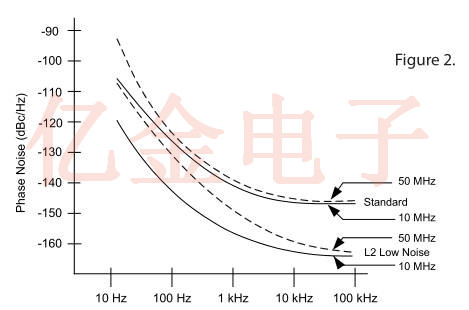 圖1中B區的噪聲稱為“1/F”噪聲,是由半導體活動引起的.采用低噪聲“L2”晶體振蕩器的設計技術將其限制在非常低的,通常無關緊要的值.圖1的區域C稱為白噪聲或寬帶噪聲.“L2”晶體振蕩器中的特殊低噪聲電路相對于標準設計提供了顯著的改進(15-20dB).當采用倍頻從較低頻率的晶體獲得所需的輸出頻率時,輸出信號的相位噪聲增加20log(倍增因子).這導致整個電路板上的噪聲降低大約為6dB,用于倍頻,10dB用于頻率三倍,20dB用于十倍乘法.
