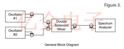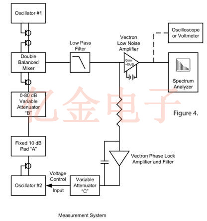 圖3示出了由NIST建議并由Vectron晶振用于測量l(f)的方法的框圖.來自兩個相同標稱頻率的振蕩器的信號被施加到混頻器輸入.除非振蕩器具有出色的穩定性,否則一個振蕩器必須具有用于鎖相的電子調諧.非常窄的頻帶鎖相環(PLL)用于在這兩個源之間保持90度的相位差.混頻器操作使得當輸入信號異相90度(正交)時,混頻器的輸出是與兩個振蕩器之間的相位差成比例的小波動電壓.通過在頻譜分析儀上檢查該誤差信號的頻譜,可以測量這對振蕩器的相位噪聲性能.如果一個振蕩器的噪聲占主導地位,則直接測量其相位噪聲.當兩個測試振蕩器電氣相似時,有用且實用的近似是每個振蕩器貢獻測量噪聲功率的一半.當三個或更多個振蕩器可用于測試時,可以通過求解表示從振蕩器對的置換測量的數據的聯立方程來精確地計算每個振蕩器的相位噪聲.