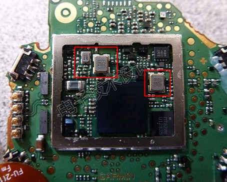 它是主系統(tǒng)CPU,即飛思卡爾(現(xiàn)恩智浦)MK28FN2M0ACAU15 Kinetis K28基于Arm Cortex-M4的應(yīng)用處理器.然而,法拉第籠一角有個(gè)大IC,其身份是個(gè)謎.另一款Garmin手表(型號(hào):A03405)有塊類似IC,FCC有照片聲稱它是Wi-Fi收發(fā)器,但由于我們已經(jīng)在PCB的另一側(cè)識(shí)別了該芯片,因此我們知道在這個(gè)特定設(shè)計(jì)中并非如此.