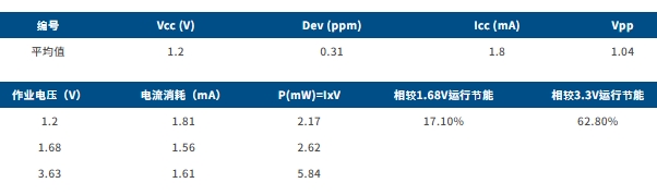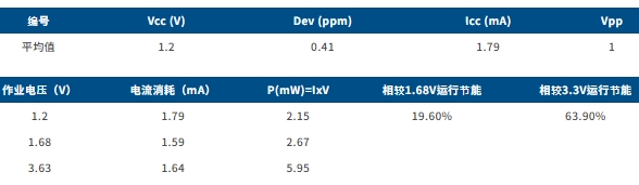 以下測試結果展示了1.2V TCXO的卓越功耗效率。 與1.68V和3.3V運行相比,1.2V在兩種封裝上都實現了顯著的節能效果。