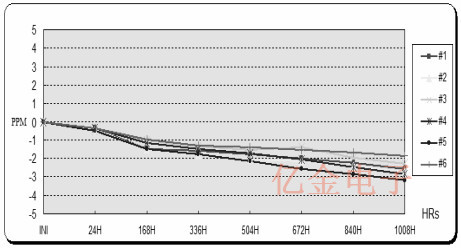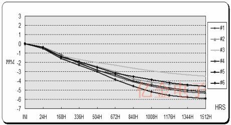 最大驅動器級別規格為100μW.頻率規格在25±3℃時<7ppm,在-20至70℃下<10ppm,和<3ppm第一年老化.石英晶體去了通過常規可靠性資格包括加速老化試驗(在100μW耗散下)通過老化和石英的高溫儲存諧振器的壽命評估,在85oC下進行1000小時石英晶體減少了在測試結束時超過1ppm.兩套(六套設備每個)相同的石英晶體經歷了相同的在650μW和950μW耗散下進行加速老化測試分別使用7400IC,C1=C2=15pF.該第一組在85℃下老化至1000小時(圖6).第二組在85oC下老化至1500小時(圖7). 1000小時后,第二盤以3比5落敗1000小時后達到ppm,1500時達到3.5至6ppm小時.第二集也開始顯示出來的跡象穩定在~1100小時.沒有顯著增加觀察到所有12個石英晶體的Rm.作為晶振晶體的總頻率為17ppm允許在25oC加上溫度范圍操作和振蕩器預計不會運行持續在85oC,客戶可能應該這樣做他們的振蕩器從頻率上沒有問題從Rm比的漂移和負阻力來看即使他們駕駛這種特殊的石英晶體方式超過規范.