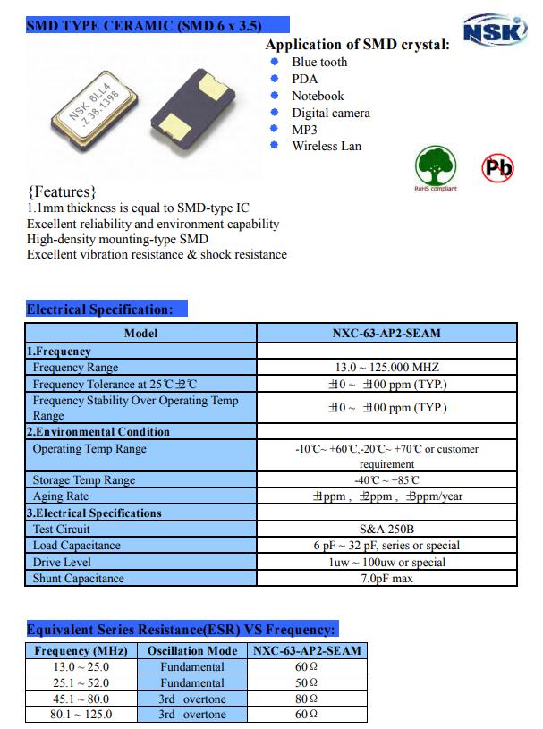 2.一個是過高溫的回流焊,由于晶振是個物理器件,在過回流焊的時候高溫可能會對晶振的頻率造成一定的影響,偏離核心頻率,這個在使用K級別晶振的時候需要特別注意。NSK津綻晶振,NXC-63-AP2-SEAM晶振,6035二腳晶振