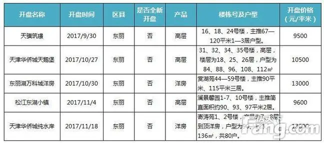 从2016年下半年开始,东丽湖片区几乎陷入了无房可售的僵局。万科、华侨城、北大资源、恒大等品牌开发商等项目产品处于“青黄不接”的境地,老产品售完,新产品并未问世。那些想在东丽湖片区置业的购房者不得不选择其他区域。直到今年,东丽湖片区才逐渐解冻,在今年的金九银十期间,东丽湖区域的项目迎来春天,短短两个月5大项目陆续加推新品,这些项目分别为天骥筑璟、天津华侨城天鹅堡、东丽湖万科城洋房、松江东湖小镇、天津华侨城纯水岸。