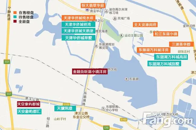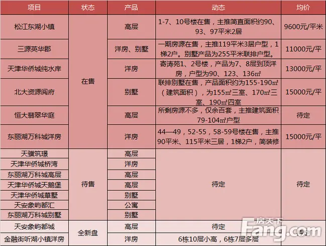 从当初的无房可售,到今日的多盘在售,东丽湖片区再度满血复活。目前东丽湖片区共有6盘在售,分别为松江东湖小镇、三源英华郡、天津华侨城纯水岸、北大资源阅府、恒大翡翠华庭、东丽湖万科城洋房。产品主要为高层、洋房和别墅。9盘待售,其中2盘为全新盘,分别为天安象屿都城、以及金融街听湖小镇洋房。天安象屿都城建筑面积470000平方米,为高层产品,具体开盘时间、价格等信息待定。金融街听湖小镇洋房由6栋10层小高,6栋7层多层围合而成,共计448户,主力户型为95㎡三室。