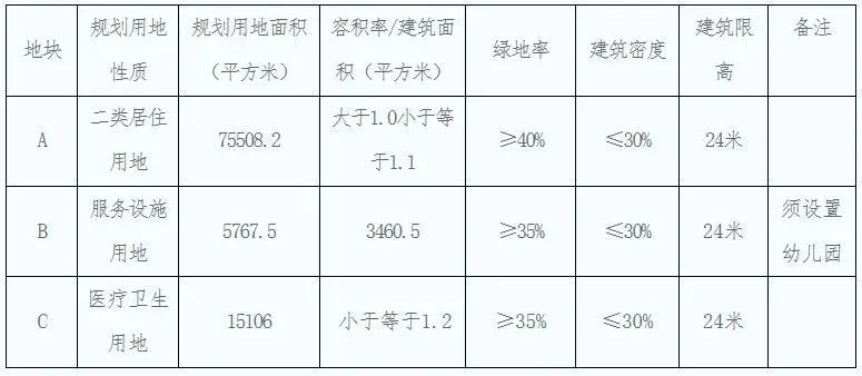 该宗地出让土地面积96382.3平方米,其中:a地块的土地出让面积为75508.6平方米,b地块的土地出让面积为5767.6平方米,c地块的土地出让面积为15106.1平方米。依据天津市规划局西青区规划分局核发的《规划条件通知书》,具体规划指标见下表: